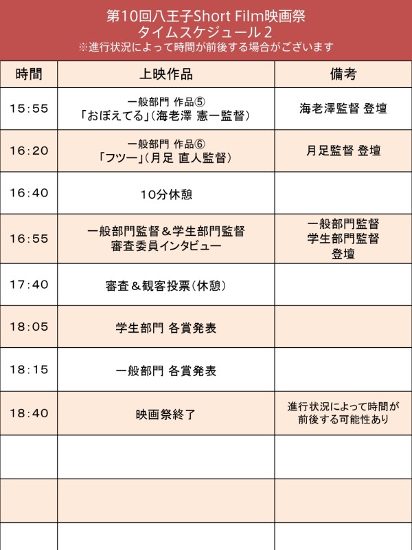 本映画祭では、【テーマに沿った15分程度の未発表の短編作品】をエントリーの条件としており、他の映画祭との違いを明確に打ち出しております。第2回開催からは、「一般部門」に加え、学生の街・八王子らしく「学生部門」を新設し、市内の大学・専門学校等を中心に広く声掛けをし、学生たちより作品を募り、学生の街八王子らしく、学生の未来を応援しております。